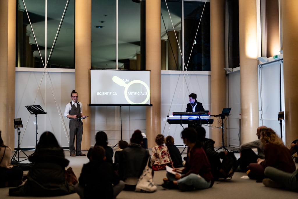Pour la Nuit Blanche, le Musée du Luxembourg a laissé carte blanche à la CIE 44 pour offrir un regard sur son exposition « Miroir du monde ». Lény, comédien, et Nicolas, pianiste-compositeur, ont choisi de créer un spectacle à la frontière de la conférence, du théâtre et du concert, en jouant avec les codes des genres pour surprendre les spectateurs. Des sauts temporels et spatiaux permettent de passer du Crétacé au XXIème siècle en passant par l’Antiquité et la Renaissance. Le cabinet de curiosité est une porte ouverte sur le monde. C’est un festival de mots, de gestes, de notes où le savoir est l’opportunité d’une grande fête, où l’on décomplexe notre rapport à la science, l’histoire ou encore la philosophie. Le public ne verra jamais plus de la même façon ces vieux objets !