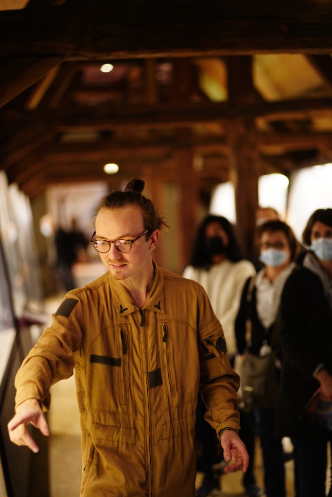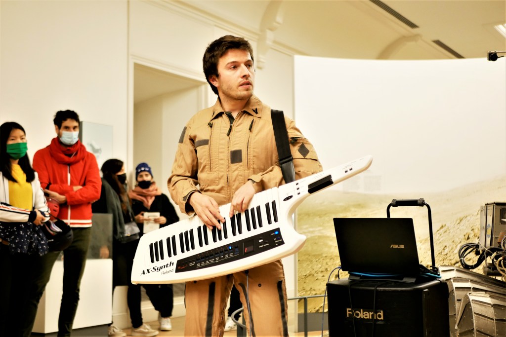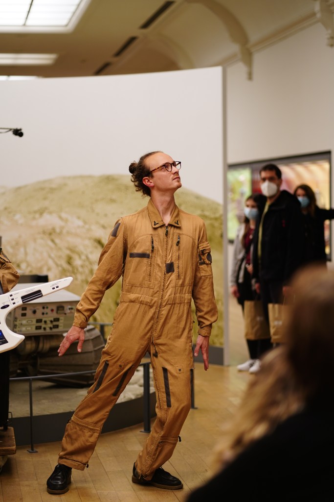 Dès les premières minutes, le public est plongé dans une expérience immersive. Les collections permanentes du Musée deviennent le lieu d’atterrissage d’une fusée d’où sortent deux astronautes. Ils interpellent directement le public : “nous vivons dans un monde principalement invisible !”. Pour démontrer leurs dires, le public est invité à les suivre pour une visite impromptue entre explications scientifiques et envolées poétiques portées par les mots et la musique. Par exemple, le télescope de Galilée devient l’occasion d’une méditation sur la voie lactée, composée, comme l’écrit l’astronome, “de troupeaux de petites étoiles éparpillées d’admirable manière”… La visite continue, pimentée de flâneries philosophiques sur le vide, le temps et l’espace, ainsi que d’expériences interactives avec le public, à l’instar de la sensation de l’attraction terrestre. Un format de visite réinventé pour sensibiliser à la science par l’art.